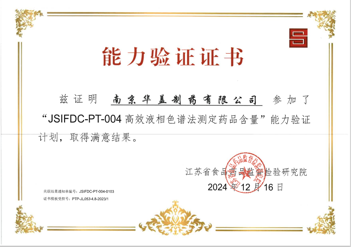 南京華蓋制藥質量控制實驗室參加了2024年度江蘇省食品藥品監(jiān)督檢驗研究院JSIFDC-PT-003紫外吸收系數(shù)法測定藥品含量、JSIFDC-PT-00高效液相色譜法測定藥品含量兩項能力驗證,并于2024年12月23日收到兩份能力驗證證書和結果通知單,兩項能力驗證均取得滿意結果!